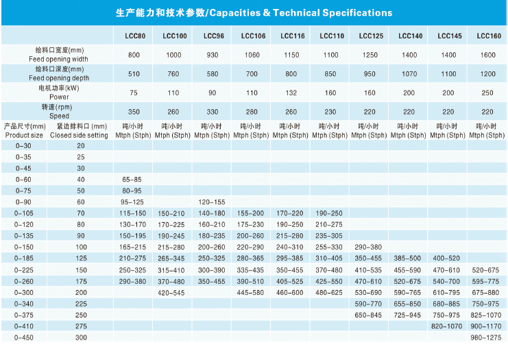 以上數(shù)據(jù)所表示的破碎機產(chǎn)量,是針對平均比重為 2.7t/m 3 ,給料能夠順利進入破碎腔、無架橋卡堵現(xiàn)象,給料剔除小于排礦口細料時取小值,含細料時取大值。產(chǎn)量可能隨給料方式和物料性質(zhì)諸如粒度組成、含水含泥量、松散密度和可碎性而變化。
